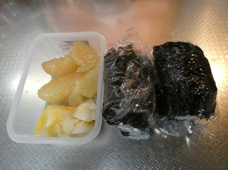 今日のお昼は、🍙2個と白菜の漬物、グレープフルーツでした🍊