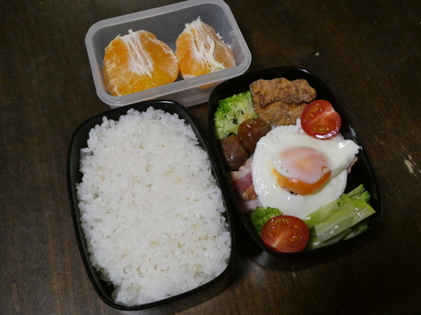今日は、ミートボール、鶏唐揚げ(冷凍)、ブロッコリー、ミニトマト、目玉焼き、