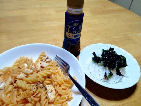 夜 ナポリタン風パスタ、大根サラダ