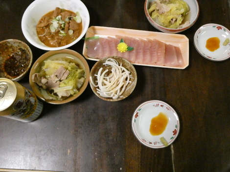 今夜は、もつ煮、お刺身、大根の皮、白菜と豚バラのくたくた煮、フキみそなどで晩酌しました😋