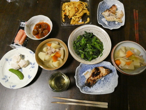 今夜は、ミートボール、割り干し大根ハリハリ漬け、赤魚ぬか漬け、ほうれん草の胡麻和え、肉じゃが、かにかま風カマボコなどで晩酌しました😋