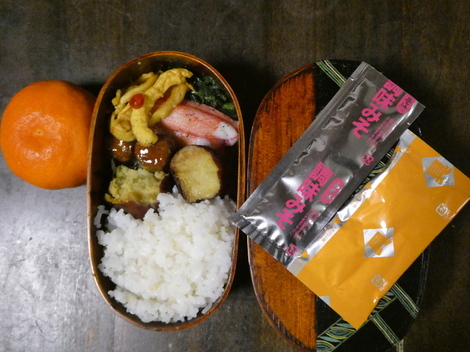 今日は、ほうれん草胡麻和え、切り干し大根ハリハリ漬け、かにかま風カマボコ、ミートボール、焼き芋、インスタントの味噌汁です(^m^)/