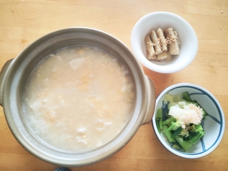 豆腐と卵の雑炊、ゆで小松菜、酢ごぼう