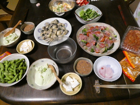 蒸牡蠣、ブロッコリー路生ハムのサラダ、イカの塩辛、枝豆、寄せ豆腐などで晩酌をしました😋