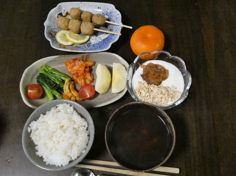 今朝は、つくね団子、ミカン、ヨーグルト(🍎ジャムとオートミール入り)、🍏リンゴ、白菜キムチ、ミニトマト、大根ハリハリ漬け、小松菜、しじみの味噌汁で朝ごはんを食べました😋