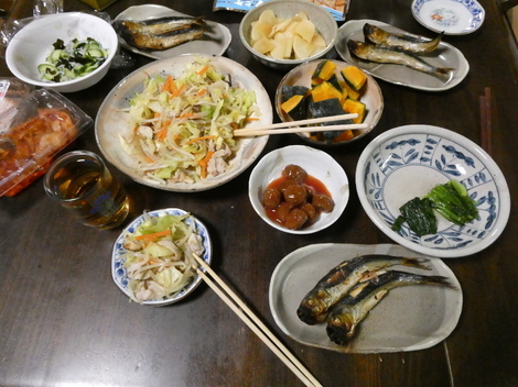 今夜は、キュウリとしらすの酢の物、野菜炒め、カボチャ、ミートボール、小松菜、イワシなどで晩酌しました😋