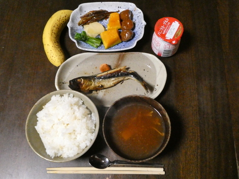 今朝は、バナナ、小松菜、タクアン、ワカサギのつくだ煮、カボチャ、ミートボール、ヨーグルト、イワシと焼きたらこ、味噌汁で朝ごはんを食べました👍