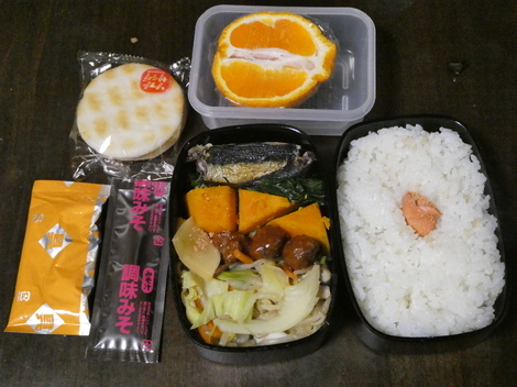 今日は、野菜炒め、ミートボール、タクアン、カボチャ、小松菜、