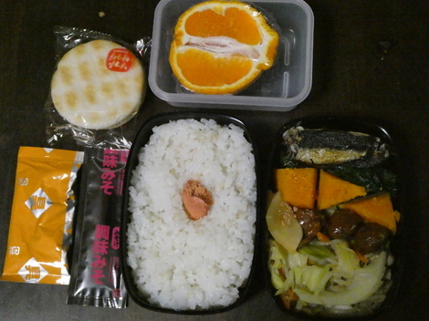 今日は、野菜炒め、ミートボール、タクアン、カボチャ、小松菜、