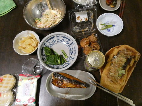 今夜は、スパサラ、タコ焼き、かき菜、たくあん、栃尾〇油揚げ、サバの塩焼き、お煎餅などで晩酌しました😋