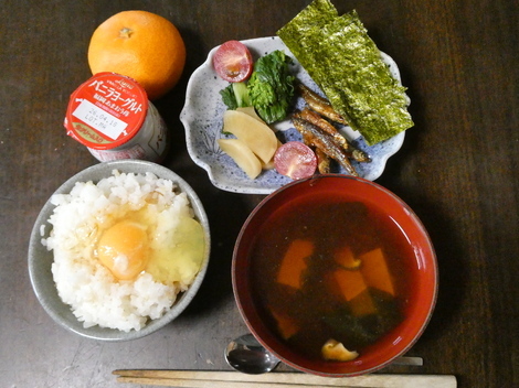今朝は、🍊ミカン、ヨーグルト、ミニトマト、たくあん、かき菜、ワカサギのつくだ煮、味付けのり、豆腐とわかめの味噌汁で卵かけご飯を食べました😋