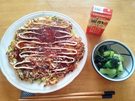 お好み焼き、ゆで小松菜、はちみつ黒酢ダイエット