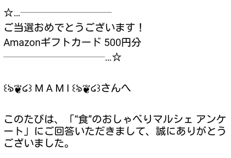 “食”のおしゃべりマルシェアンケートにてAmazonギフトカードが当たりました🎯ありがとうございました(୨୧ᵕ̤ᴗᵕ̤)🙏🏻✨