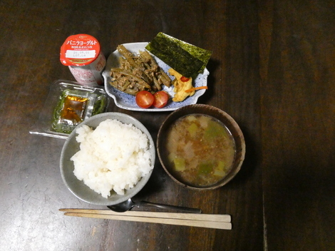 今朝は、ヨーグルト、フキの鯖缶煮込み、ミニトマト、大根ハリハリ漬け、味付けのり、味噌汁で朝ごはんを食べました😋