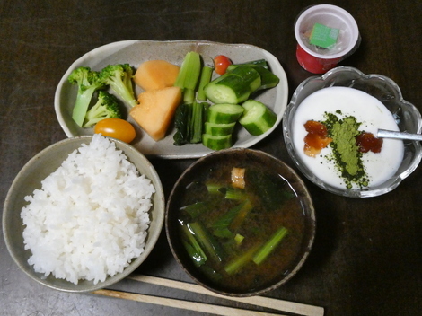 今朝は、ブロッコリー、🍈メロン、小松菜、ミニトマト、きゅうりのぬか漬け、納豆、リンゴジャムと抹茶を入れたヨーグルト、ワカメと小松菜の味噌汁でした👍