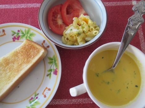トースト、マカロニサラダ、カボチャスープ、スイカ