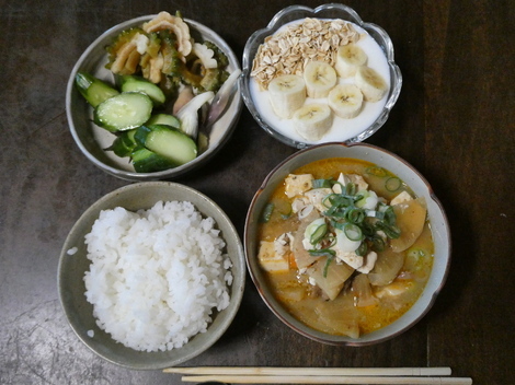 今朝は、きゅうりとミョウガのぬか漬け、ニガウリのポン酢漬け、バナナとオートミールを入れたヨーグルト、もつ煮でした(^m^)/