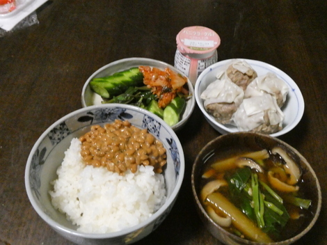 今朝は、きゅうりのぬか漬け、空芯菜、白菜キムチ、シュウマイ、ナスとキノコなどの味噌汁、納豆かけご飯、最後にヨーグルトでした😋