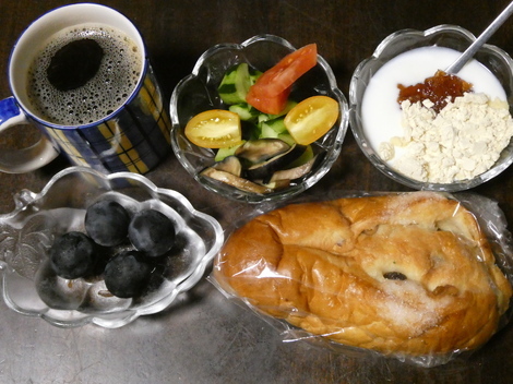 そのほかに、ぶどう、インスタントコーヒー、キュウリとナスの浅漬け、🍅トマト、ミニトマト、おからパウダーとリンゴジャムを入れたヨーグルトでした😋