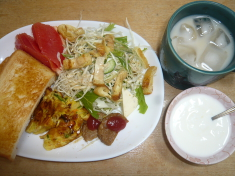 グレープフルーツ、油揚げサラダ、チーズ、ハンバーグ、スペインオムレツ、トースト、ヨーグルト、豆乳ティー