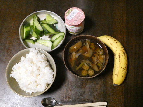今朝は、きゅうりのぬか漬け、ヨーグルト、バナナ、ナスとオクラとミョウガの味噌汁でした😋