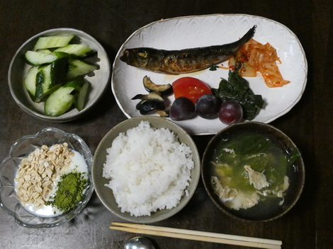 今朝は、きゅうりのぬか漬け、イワシ(昨夜の残り)、キムチ、ナスの漬物、🍅トマト、空芯菜、ぶどう、レタスの卵スープ、オートミールと抹茶を入れたヨーグルトでした👍