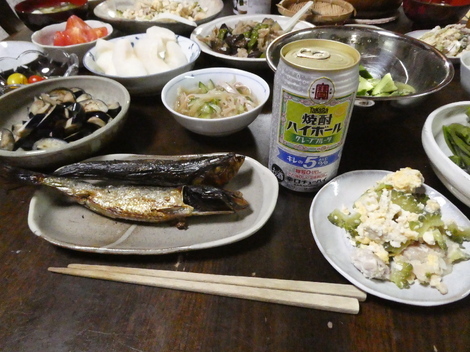 昨夜は、🍅トマト、ゴーヤーチャンプルー、ナスと豚肉のオリーブオイル炒め、キュウリの浅漬け、ナスの漬物、イワシ焼きなどで晩酌しました😋