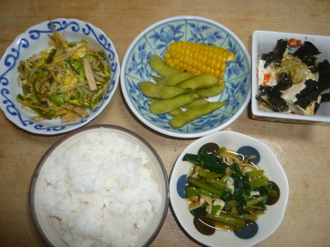 ピリ辛豆腐、小松菜油揚げ煮びたし、野菜とソーセージ、卵の炒め物、とうもろこし枝豆、ご飯