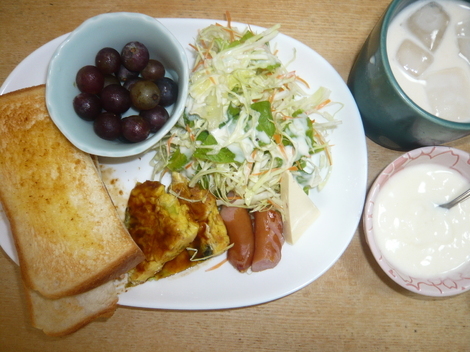 ぶどう、サラダ、チーズ、ウインナー、キャベツオムレツ、トースト、ヨーグルト、ミルクティー