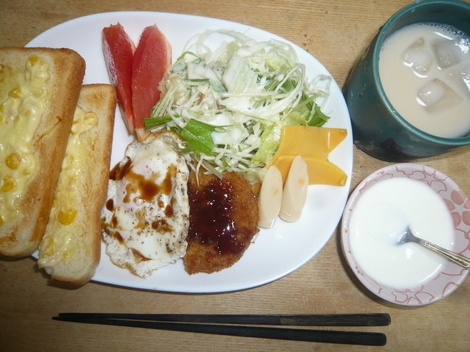 グレープフルーツ、サラダ、チーズ、チーカマ、コロッケ、目玉焼き、コーントースト、ヨーグルト、豆乳ティー