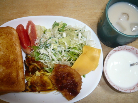 りんご、サラダ、一口チーズ、鶏キャベツオムレツ、チキンカツ、パン、ヨーグルト、豆乳ティ―