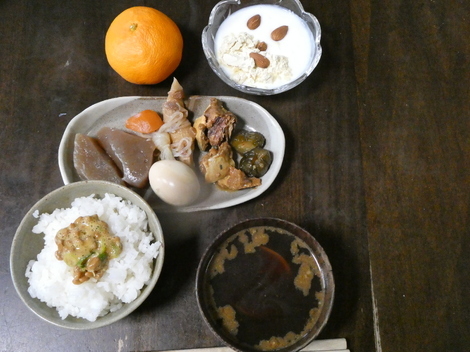 今朝は、🍊ミカン、アーモンドとおからパウダーを入れたヨーグルト、キュウリの漬物、サバの缶詰(みそ味)、おでん、アサリの味噌汁、納豆かけご飯でした😋