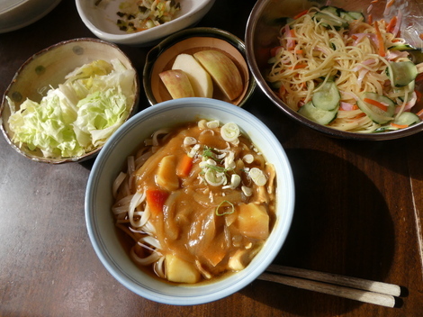 今日のお昼は、カレーうどん、スパサラ、リンゴ、レタスサラダ、キャベツと昆布の浅漬けなどを食べました(^m^)/