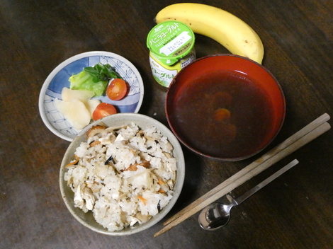 今朝は、たくあん、青梗菜、ミニトマト、ヨーグルト、バナナ、しじみの味噌汁で五目ごはんを食べました😋