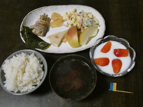 今朝は、味付けのり、エノキ肉巻き、たくあん、聖護院大根甘酢漬け、🍎リンゴ、マカロニサラダ、イチゴ入りのヨーグルト、しじみの味噌汁で朝ごはんを食べました😋