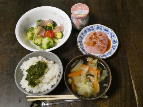 今朝は、ブロッコリーと生ハムのサラダ、ヨーグルト、マグロのたたき、野菜スープ、メカブかけご飯でした👌