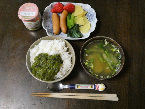 今朝は、ヨーグルト、イチゴ🍓、ウインナー、小松菜、たくあん、味噌汁(インスタント)、メカブかけご飯でした😋