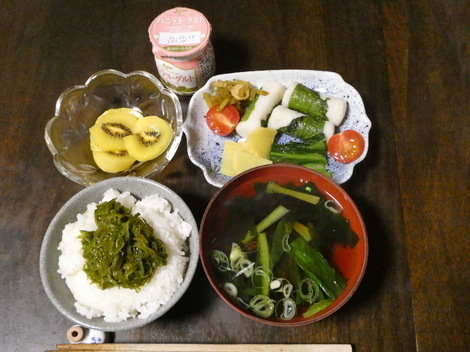 今朝は、ヨーグルト、キウイ、ワサビのしょうゆ漬け、しそカマボコ、ミニトマト、たくあん、小松菜、味噌汁(インスタント)、メカブかけご飯を食べました😋