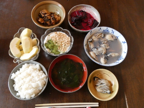 今日のお昼は、たらこ昆布のつくだ煮、梅干、牡蠣、オートミールと抹茶を入れたヨーグルト、🍎リンゴ、わかめの味噌汁でした(^m^)/