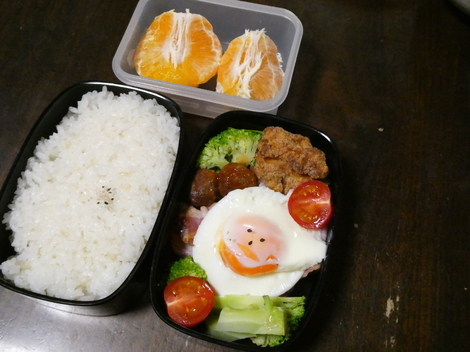 今日は、ミートボール、鶏唐揚げ(冷凍)、ブロッコリー、ミニトマト、目玉焼き、