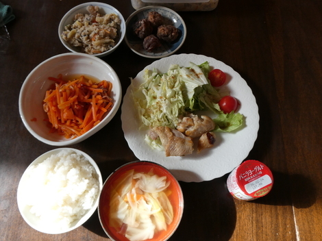 今日のお昼は、おから、干柿、キャベツとレタスのサラダ、鶏肉のガーリック焼き、イカニンジン、ヨーグルト、キャベツのスープでお昼ごはんを食べました😋