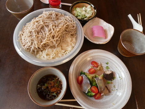 手作りこんにゃく、さつま芋、鳥ササミの大葉チーズはさみ焼き、千切りキャベツ、キューリ、ミニトマトです。