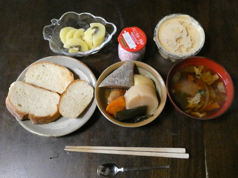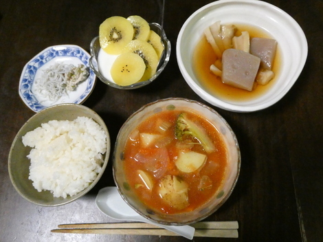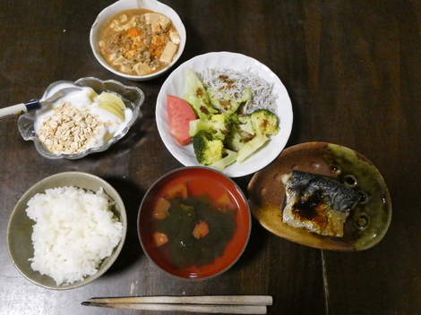 今朝は、オートミールとキウイを入れたヨーグルト、マーボー豆腐、野菜サラダしらす干し入り、サバ塩焼き、トマトとわかめのスープ、ごはんでした😋