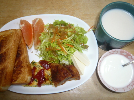 トースト、紅茶、昨夜のチキンステーキ、マカロニチーズ、ヨーグルト(バナナ&パイン)、ゆでたまご
