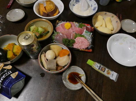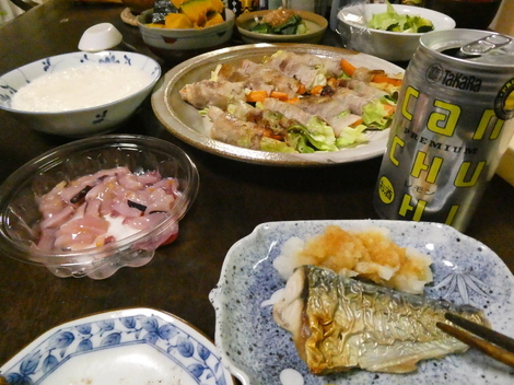 今夜は、山芋、野菜の肉巻き、カボチャ、イカの塩辛、サバの塩焼きなどで晩酌しました😋