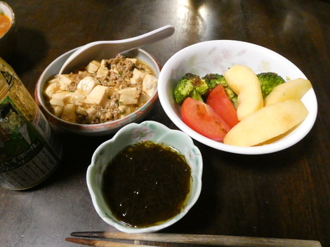 今夜は、マーボー豆腐、ブロッコリーとトマトのサラダ、リンゴ、モズク酢などで晩酌しました😋