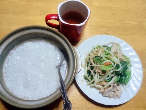 豚レバーときのこの炒め煮・温奴・じゃこと油揚げと小松菜のサラダ
