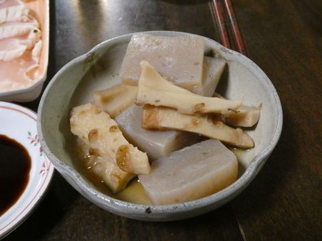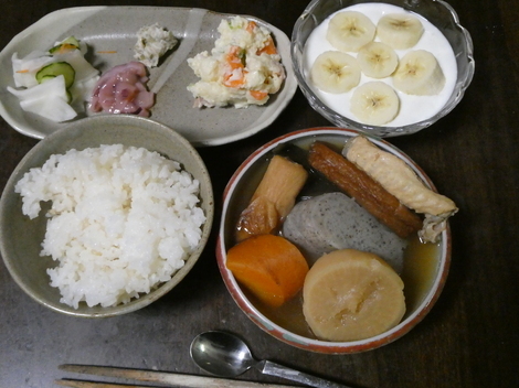 今朝は、カブときゅうりの浅漬け、イカの塩辛、わさび漬け、ポテトサラダ、バナナ入りヨーグルト、おでん、ご飯でした😋