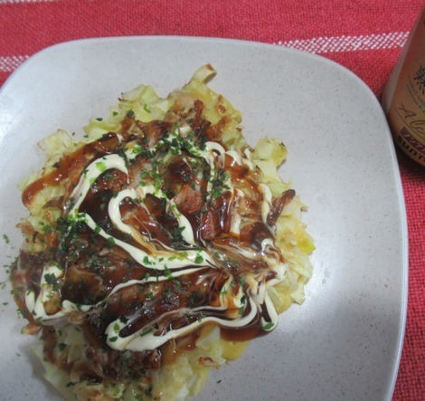お好み焼きにシーフードミックス(海老、イカ、アサリ)入れて