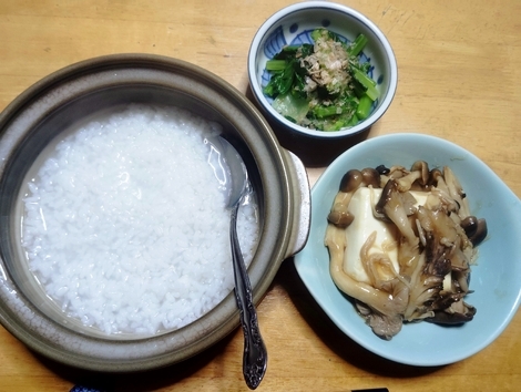鶏団子ときのこの坦々煮・温奴・じゃこと油揚げと小松菜のサラダ